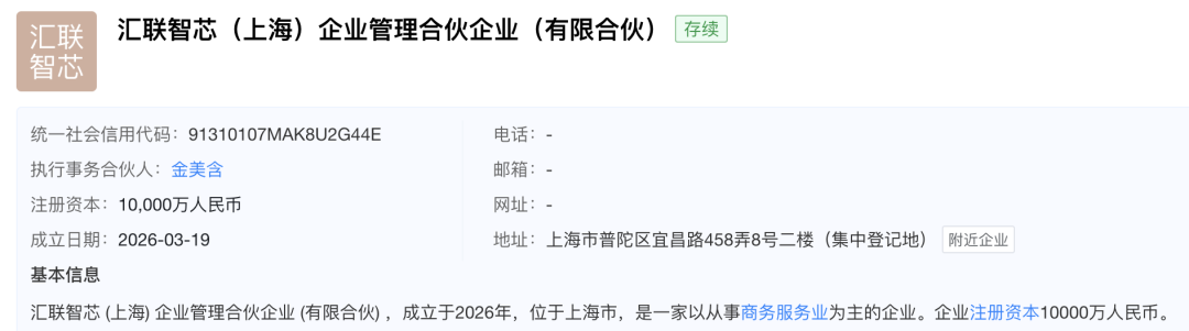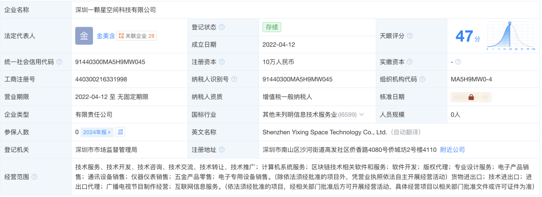 信息显示,深圳一颗星空间科技有限公司法定代表人金美含,同时是汇联智芯(上海)企业管理合伙企业的执行事务合伙人。该公司成立于2026年3月19日,金美含持股80%,汇芯二十二期股权投资(南平)合伙企业(有限合伙)持股20%。