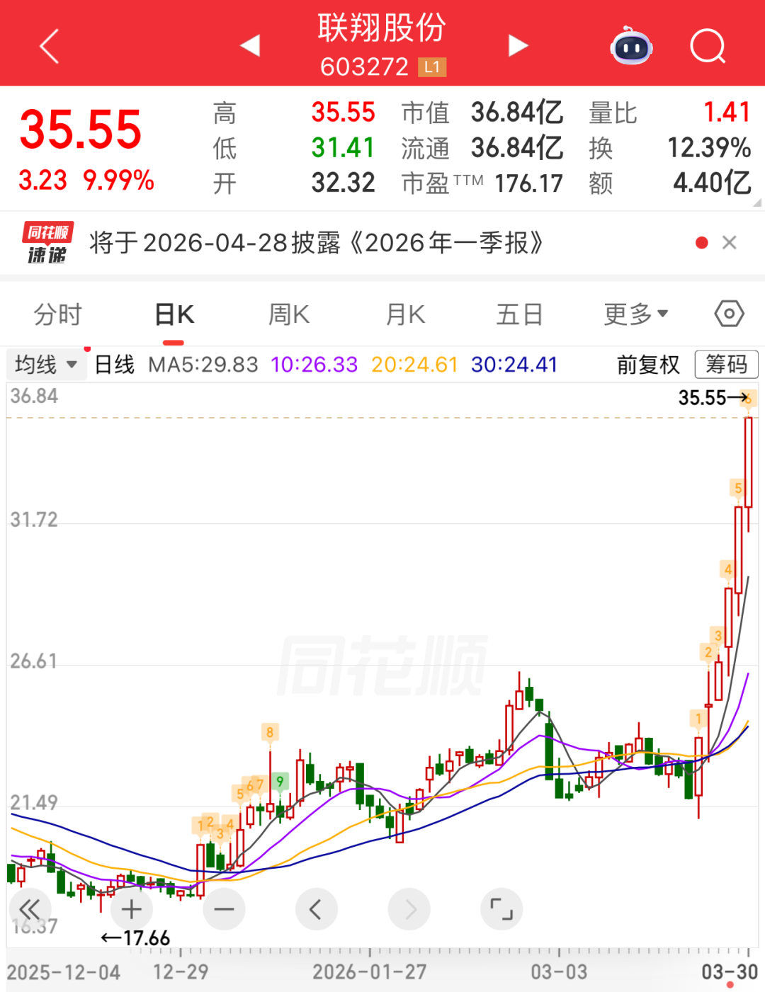 数据显示,3月30日,联翔股份股价收报35.55元/股,创历史新高,最新市值为36.84亿元。