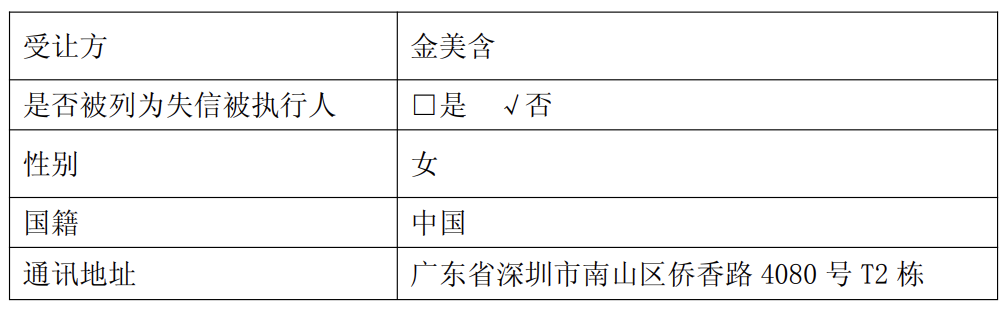 根据公司公告中披露的受让人金美含的通讯地址信息,核对信息可以发现,深圳一颗星空间科技有限公司法定代表人与上述受让人重名,也为金美含。