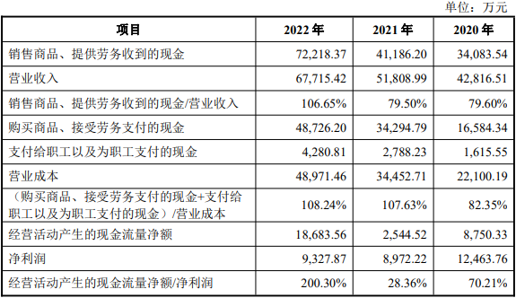 2020年至2022年,恒兴新材经营活动产生的现金流量净额分别为8,750.33万元、2,544.52万元和18,683.56万元,净现比分别为70.21%、28.36%和200.30%;销售商品、提供劳务收到的现金分别为34,083.54万元、41,186.20万元和72,218.37万元,占营业收入的比重分别为79.60%、79.50%和106.65%。