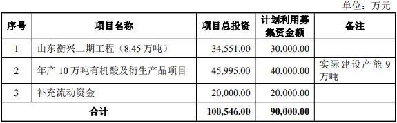 恒兴新材本次发行募集资金总额102,920.00万元,扣除发行费用后,募集资金净额为90,538.59万元。该公司最终募集资金净额比原计划多538.59万元。恒兴新材于2023年9月20日披露的招股说明书显示,其拟募集资金90,000.00万元,分别用于山东衡兴二期工程(8.45万吨)、年产10万吨有机酸及衍生产品项目和补充流动资金。