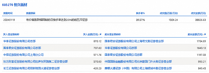 1月19日,恒兴新材今日跌9.45%,全天换手率达39.57%,振幅达9.13%。龙虎榜数据显示,营业部席位合计净卖出3225.13万元。其中,国泰君安证券上海号文路证券营业部、华泰证券总部分别卖出1704.89万元、1640.13万元;华泰证券总部、国泰君安证券总部分别买入870.12万元、707.63万元。