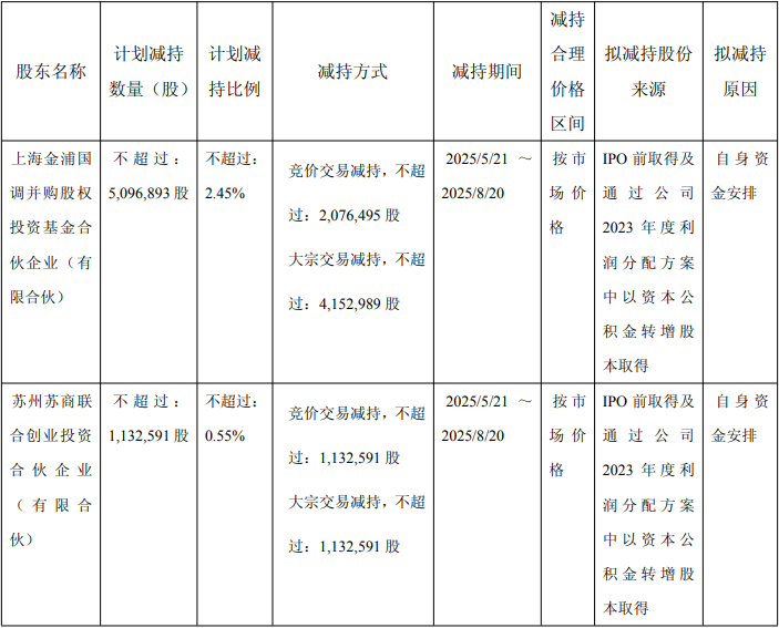 其中,金浦国调计划通过集中竞价或大宗交易方式减持不超过公司总股本2.45%,减持数量不超过5,096,893股;苏商投资计划通过集中竞价或大宗交易方式减持不超过公司总股本0.55%,减持数量不超过1,132,591股。