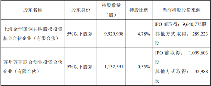 截至公告披露日,金浦国调持有公司无限售条件流通股9,929,998股,占公司总股本4.78%。苏商投资持有公司无限售条件流通股1,132,591股,占公司总股本0.55%。金浦国调和苏商投资为一致行动人,合计持有公司无限售条件流通股11,062,589股,占公司总股本的5.33%。上述无限售条件流通股已分别于2024年10月15日、2025年3月25日解除限售并上市流通。