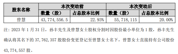 2023年1月11日至2025年6月24日,公司因股权激励授予股份登记完成、股权激励对象离职回购注销股份、2024年度权益分派资本公积转增股本原因,总股本从190,873,778股增加至278,590,823股,曾慧通过集中竞价及大宗交易方式合计减持了公司4,153,446股股份,持股比例由22.93%降至20.00%。