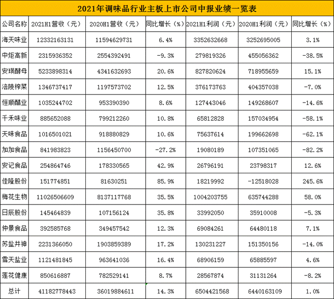 从2021年上半年财报看到,16家调味品上市公司2021年上半年营业收入合计为411.8亿元,同比增长14.3%;净利润合计65亿元,同比增长1.0%。