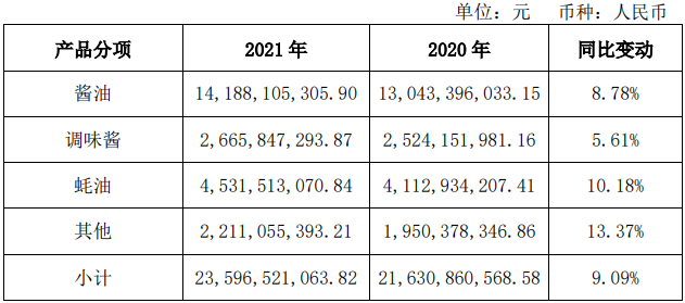 海天味业各产品营收情况