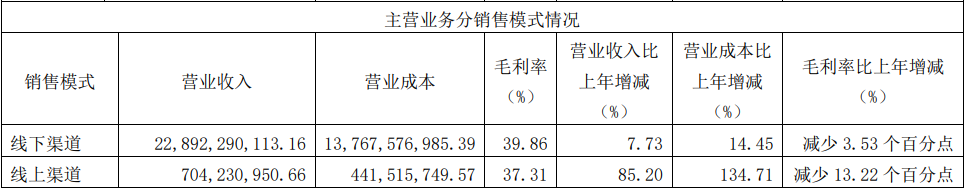 分渠道来看,海天味业线上渠道增速远超线下。线上渠道同比增长85.2%,而线下同比增长7.73%。尽管如此,线上渠道整体营收占比仍不超过3%,其增幅较高多因基数过底所致。值得注意的是,线上毛利率滑坡明显,去年毛利率同比减少了13.22个百分点至37.31%,已落后于线下渠道。公司称,这是线上拓展增加市场投入所致。