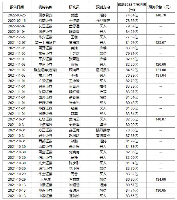 2022年3月25日,海天味业(603288)新增1家机构对其2022年度业绩做出预测。6个月内累计共34家机构,预测2022年净利润均值为81.81亿元,较去年同比增长22.65%。其中,17家机构“买入”,9家机构“增持”,4家机构“推荐”,2家机构“强烈推荐”,1家机构“审慎增持”,1家机构“区间操作”。目标价格最高预测140.70元,最低预测120.00元,平均为130.69元。
