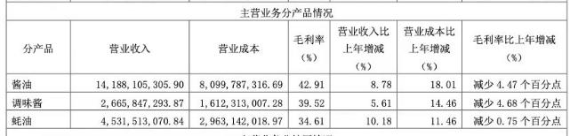 佛山市海天调味食品股份有限公司(简称“海天味业”)酱油实现营收141.88亿元,增长8.78%;蚝油实现营收45.32亿元,增长10.18%;酱料实现营收26.66亿元,增长5.61%,市占率稳步提升。