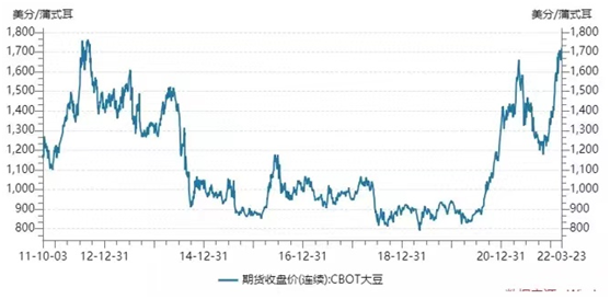 受中美持续近两年的贸易争端以及美国大豆种植时期天气不利影响,2019/2020年度美豆产量大幅下滑25%,造成全球大豆市场巨大的供给缺口,美豆价格便开始从低位一路上涨。疫情之后,全球供应链紊乱,粮食市场普遍大涨,进一步助推了大豆价格走势。有统计显示,自2019年低点至今,美豆期货价格已上涨接近1倍。