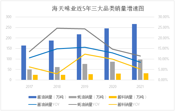 海天味业披露的2021年报显示,2021年,酱油、蚝油、酱料三大核心品类分别销售266万吨、96.14万吨、30.96万吨,同比增速均有不同程度的放缓,其中酱油从12.99%下滑至8.44%,蚝油从14.74%下滑至11.47%,酱料从9.94%下滑到5.2%。