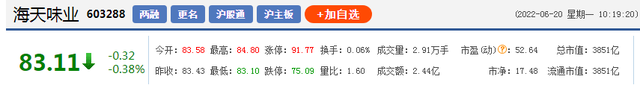 以6月20日同时刻的市盈率来比较,海天味业的市盈率为53.1倍,中炬高新的市盈率为39.5倍,恒顺醋业的市盈率为39.28倍,相比较其他调味品上市企业,海天味业的市盈率一直处于偏高水平。