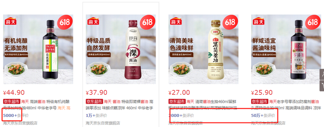 像高广付所说的高端酱油的价格不高端,在全国范围内并不罕见,很多企业为了去库存或抢占市场经常以五折的价格进行销售,在某些电商节的情况下,线上销售的价格更是低到“亲民”,海天酱油京东自营店500ml最高售价为44.9元,但相比25.9元的品类,销量不可同日而语。