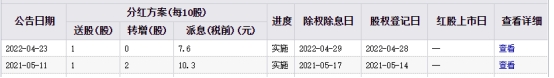 2021年5月11日,海天味业公告称,向全体股东每股派发现金红利1.03元(含税),每股派送红股0.1股,以资本公积金向全体股东每股转增0.2股,股权登记日2021年5月14日,除权(息)日2021年5月17日。2022年4月23日,海天味业公告称,向全体股东每股派发现金红利0.76元(含税),每股派送红股0.1股,股权登记日2022年4月28日,除权(息)日2022年4月29日。