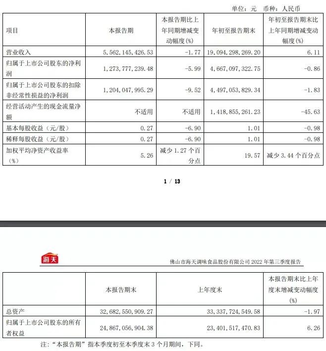 根据海天味业披露的2022年第三季度主要经营数据公告显示,前三季度海天味业实现营业收入190.94亿元,同比增长6.11%;实现归属净利润46.67亿元,同比下跌0.86%。这是海天味业自2014年2月在上交所上市以来,为数不多的出现三季报业绩下滑的情况。
