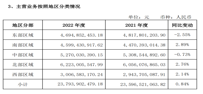 从区域上看,2022年,海天味业在东部、中部区域均出现小幅下滑,其余区域呈现微增态势。按销售模式看,线下渠道实现营收228.05亿元,微跌0.38%;线上渠道实现营收9.89亿元,同比增长40.39%。