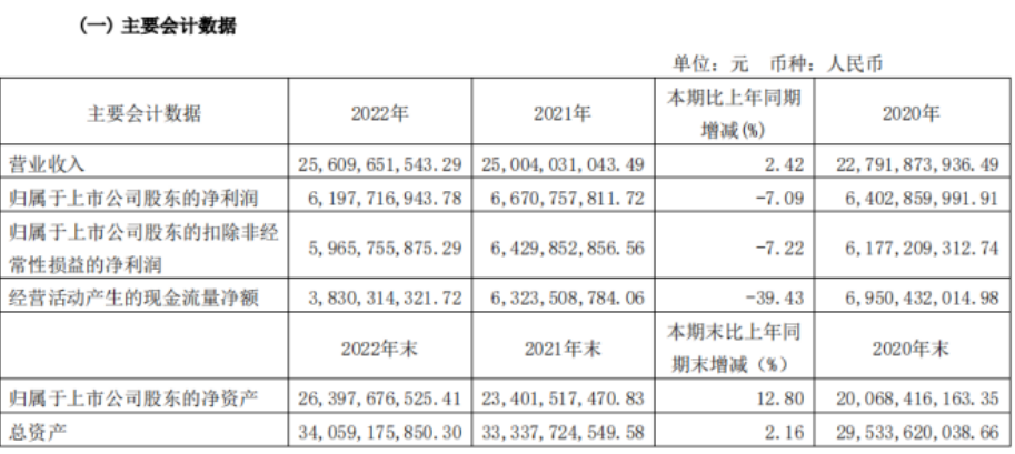 4月25日,海天味业发布2022年业绩报告及2023年第一季度报告。其中,2022年,海天味业实现营业收入256.10 亿元,同比增长 2.42%;归属于上市公司股东的净利润61.98 亿元,同比减少 7.09%;归属于上市公司股东的净资产263.98 亿元,同比增长 12.80%;整体净利率24.22%,同比下降 2.46 个百分点。