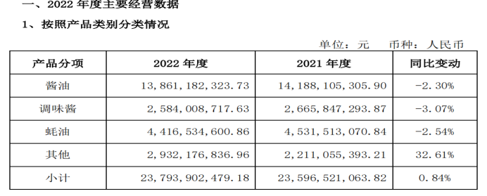 海天味业曾在2021年年报中提出,2022年的目标是营业收入达到280亿元,利润达到74.7亿元。目前来看,海天味业并未完成彼时提出的经营目标。具体到经营数据中:细分品类中,2022年,海天味业酱油实现营收138.61亿元,同比下跌2.3%;调味酱实现营收25.84亿元,同比下跌3.07%,蚝油实现营收44.17亿元,同比下跌2.54%;其他产品实现营收29.32亿元,同比增长32.61%。