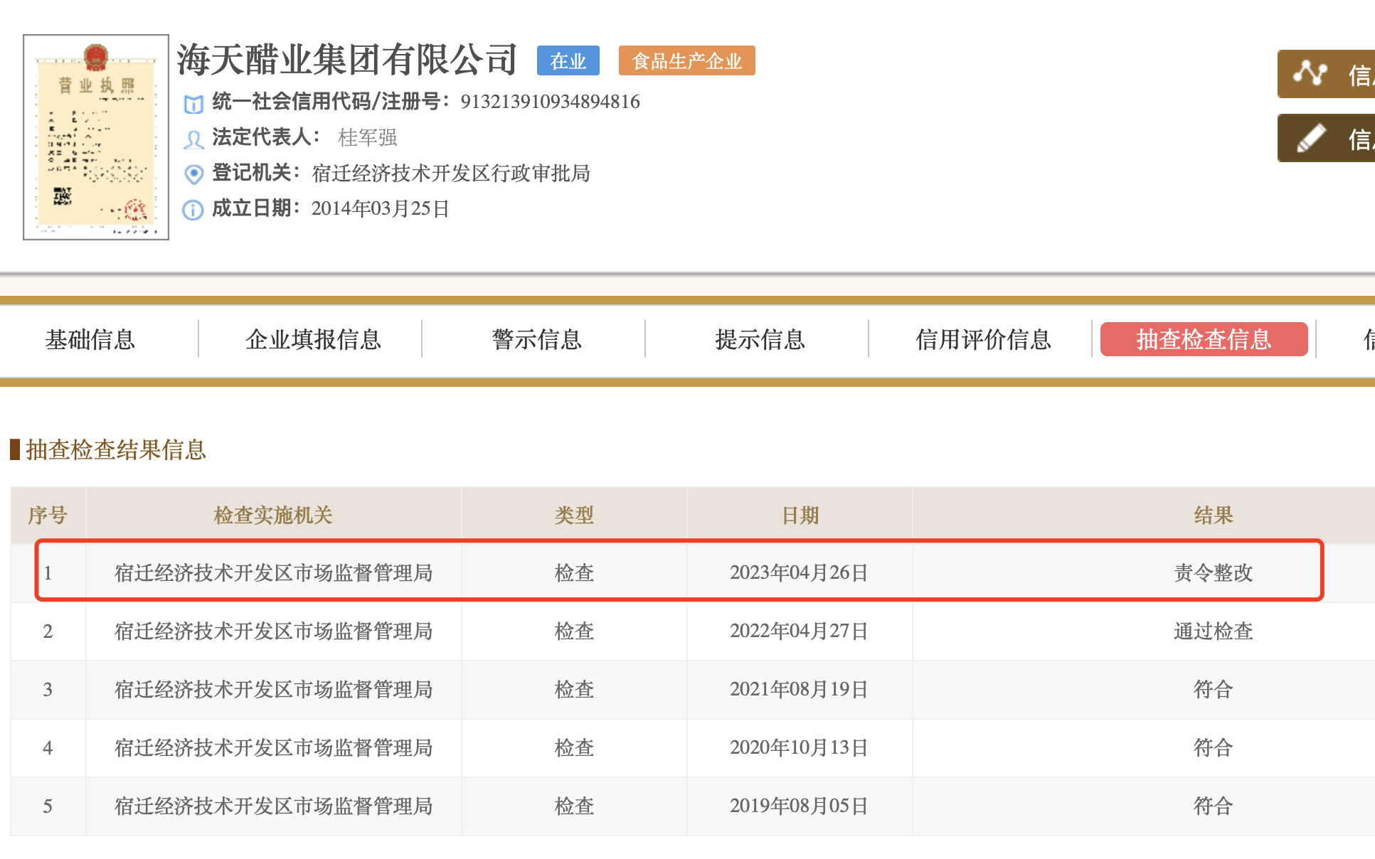 国家企业信用信息公示系统显示,2023年4月26日,宿迁经济技术开发区市场监督管理局对海天醋业进行抽检检查,检查结果为责令整改。