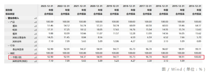 然而,海天味业的出海之路并非一帆风顺。尽管早在1993年,海天味业就已获得自营进出口业务批准,并首次打入美国市场,但多年来,其在海外市场的表现并不突出。数据显示,在2014年至2023年的十年间,海天味业在中国大陆地区的收入占比一直保持在92%以上,海外市场占比微乎其微。