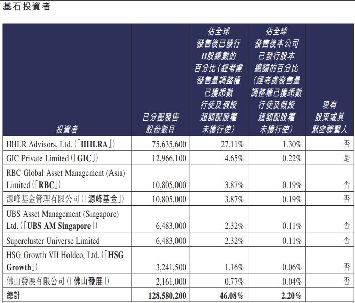 海天味业的基石投资者分别为高瓴HHLR Advisors、GIC Private Limited、RBC Global Asset Management、源峰基金、UBS Asset、Supercluster Universe、HSG Growth(红杉中国)、佛山发展。