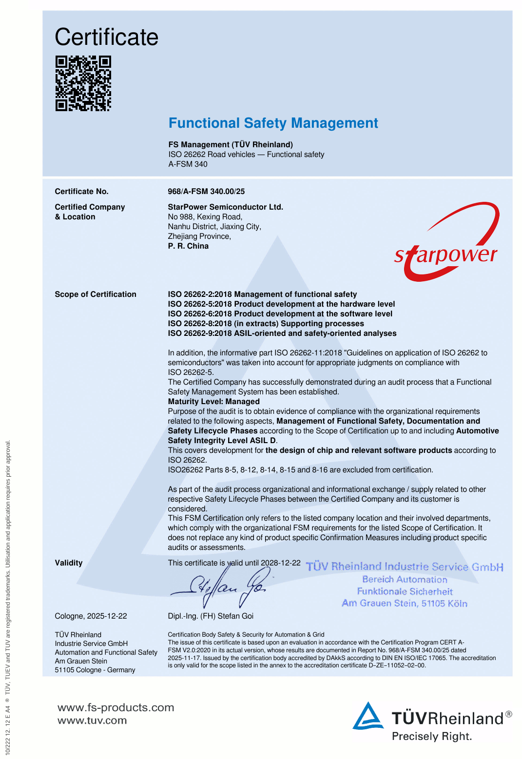近日,斯达半导体股份有限公司(以下简称“斯达半导体”)正式获得德国莱茵TüV集团(以下简称“TüV莱茵”)颁发的ISO 26262:2018功能安全管理体系认证证书。这标志着斯达半导体已建立起符合汽车功能安全最高等级“ASIL D”要求的产品开发流程体系,具备为行业提供高安全、高可靠性产品与解决方案的完整能力。