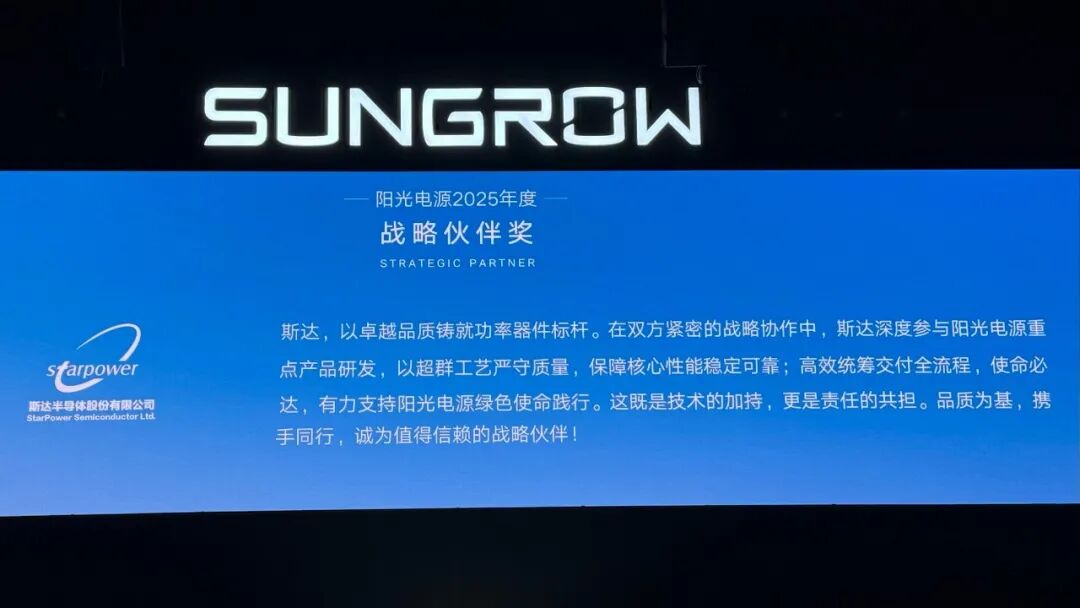 | 在阳光电源2026全球合作伙伴大会上,斯达半导体凭借“以超群工艺严守质量、保障核心性能稳定可靠、高效统筹交付全流程”等卓越贡献,荣获阳光电源“2025年度战略伙伴奖”。这是斯达半导体连续三年获此殊荣,不仅体现了阳光电源对双方战略合作成果的高度认可,更凸显了“战略伙伴”在新能源产业生态中的核心价值。 |