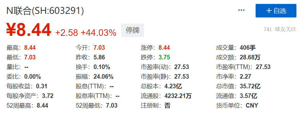 截止9:30,N联合(SH:603291)涨44.03%,现报8.44元,成交额28.68万元,总市值35.72亿元。