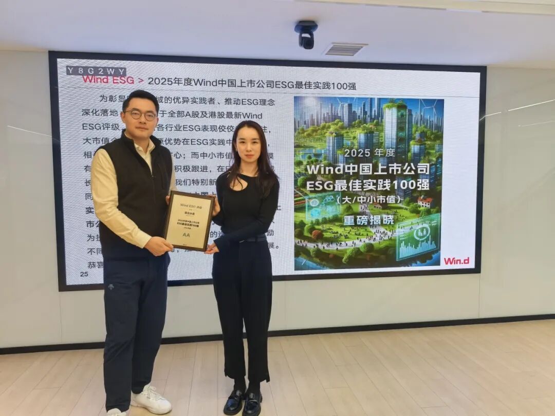 近日, 联合水务 凭借在可持续发展领域的深度布局与亮眼成果,成功入选“2025年度 Wind 中国上市公司ESG最佳实践100强(中小市值)”,连续两年荣登该权威榜单。12月18日,颁奖仪式在公司上海总部举行, Wind ESG团队代表为公司颁发奖牌。