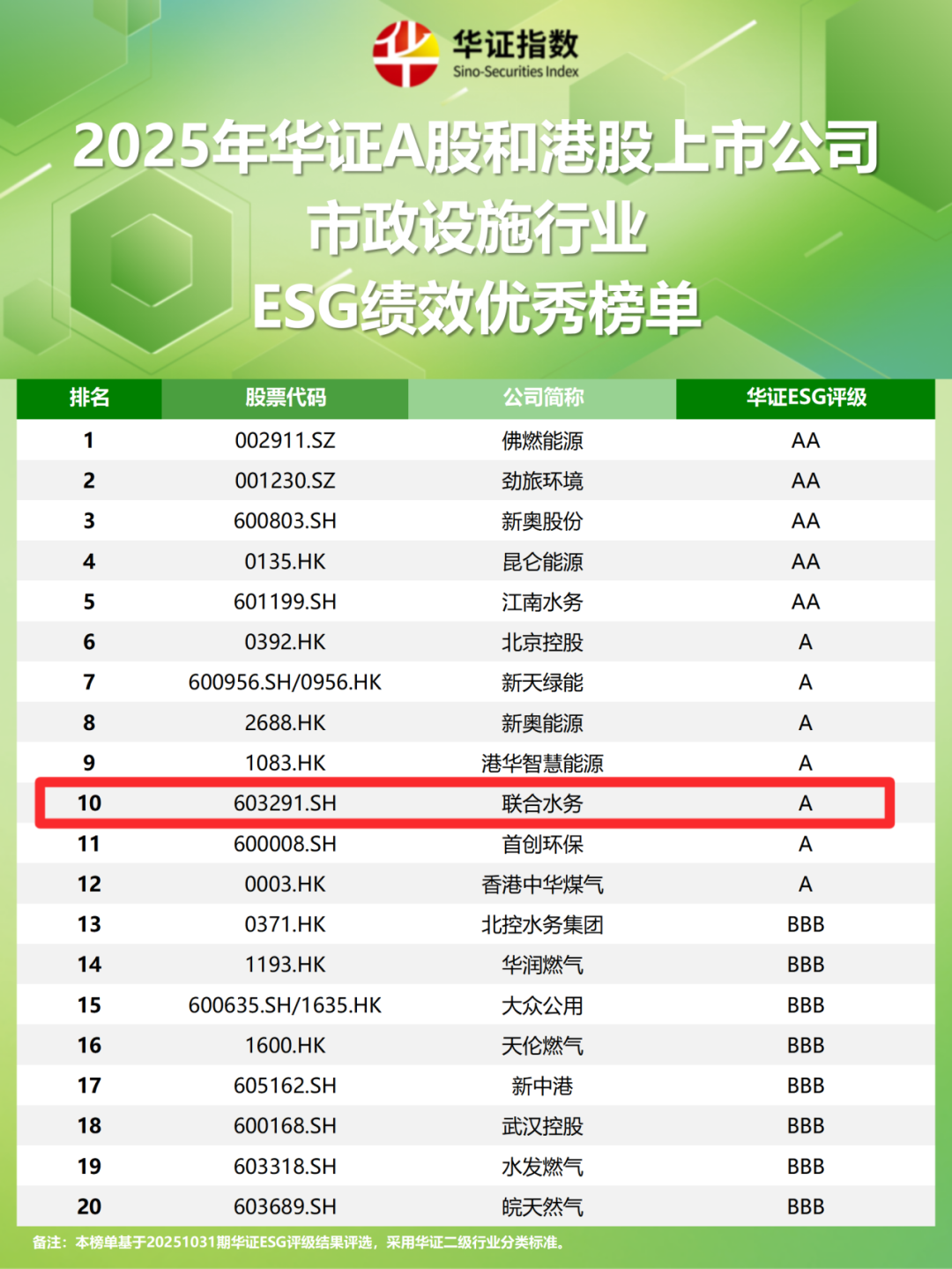 同时,华证ESG基于最新一期评级结果,评选出A股和港股各二级行业2025年ESG绩效优秀的公司, 联合水务 凭借在ESG领域的优异表现,成功入选“2025年华证A股和港股上市公司市政设施行业ESG绩效优秀榜单”。