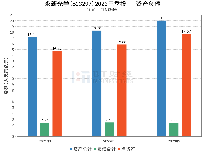 在资产负债方面,永新光学2023年三季报显示,公司总资产达到20亿元,较上年度末的19.13亿元增长了4.55%。负债合计为2.33亿元,相比上年度末的2.45亿元有所下降。净资产则从上年度末的16.68亿元增长至17.67亿元,资产负债率从12.81%降至11.66%,反映出公司的资产结构更为稳健,财务风险得到有效控制。