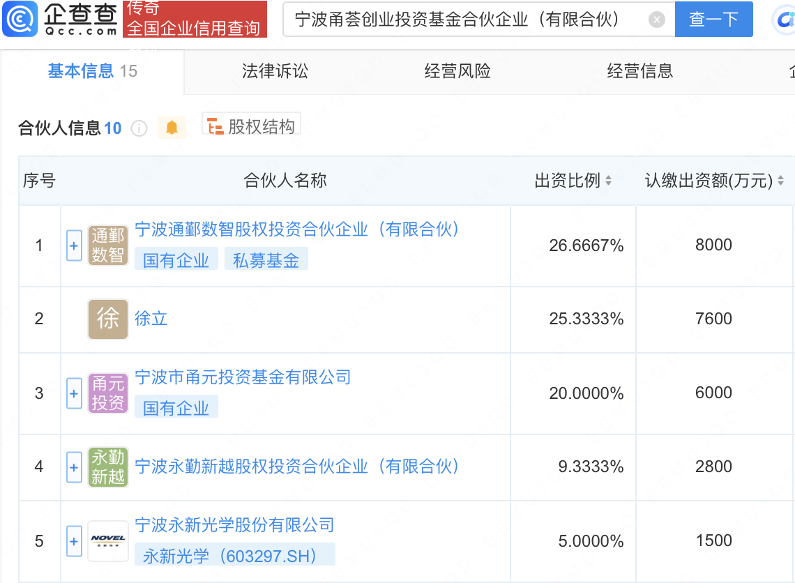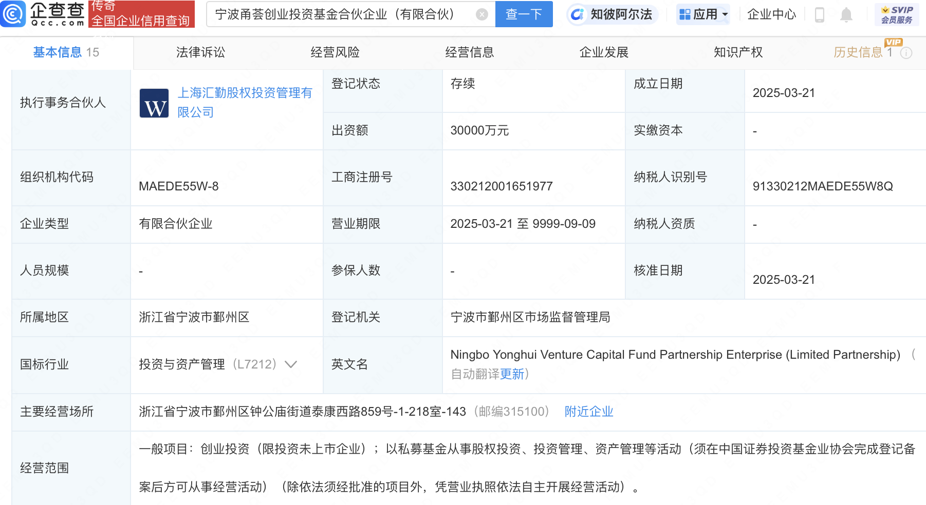 近日,宁波甬荟创业投资基金合伙企业(有限合伙)成立,出资额3亿元,经营范围包含:创业投资(限投资未上市企业);以私募基金从事股权投资、投资管理、资产管理等活动。