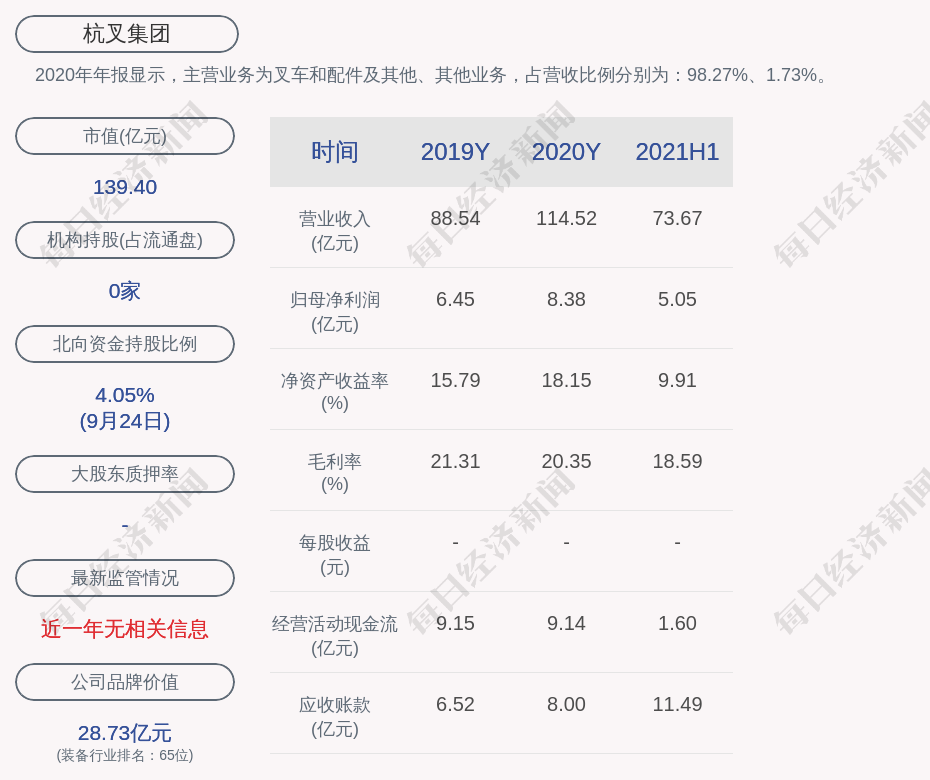 2020年年报显示,杭叉集团的主营业务为叉车和配件及其他、其他业务,占营收比例分别为:98.27%、1.73%。