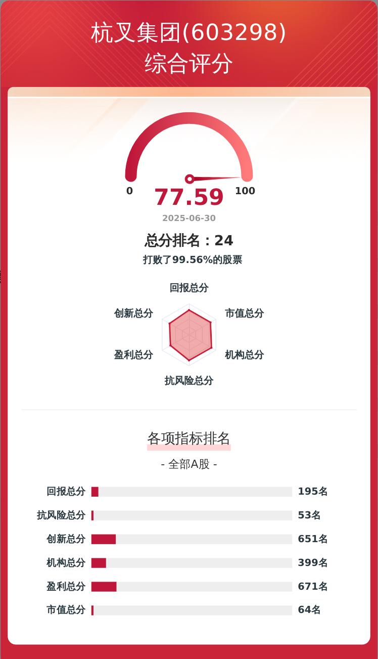 上市公司研究院构建了一套上市公司韧性评价体系,从企业盈利、科技创新、股东回报、经营抗风险、市值表现及机构吸引力六个维度对企业进行量化评分,满分为100分。杭叉集团的韧性评价总分为77.59分,在A股5405家可比上市公司中排名第24位。