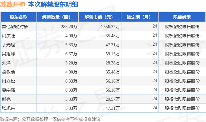 根据市场公开信息整理,苏盐井神(603299)于4月29日将有332.73万股限售股份解禁上市,为公司股权激励限售股份,占公司总股本0.43%。本次解禁后,公司还有852.27万股限售股份,占总股本1.09%。具体如下图所示: