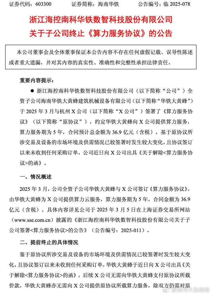 9月30日,海南华铁(证券代码:603300)发布公告称,其全资子公司海南华铁大黄蜂建筑机械设备有限公司与杭州某公司(公告中隐去具体名称,以“X公司”代称)于今年3月签署的《算力服务协议》已经终止。这份原本为期5年、总金额高达36.9亿元的合同,在喧嚣登场后悄然落幕。