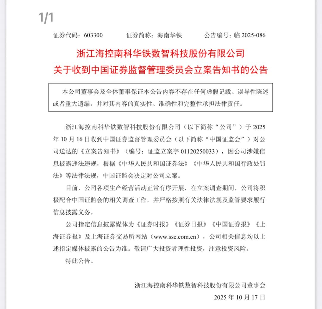 10月16日晚间,海南华铁(603300.SH)公告称,公司于2025年10月16日收到中国证监会的《立案告知书》,因涉嫌信息披露违法违规,中国证监会决定对公司立案。