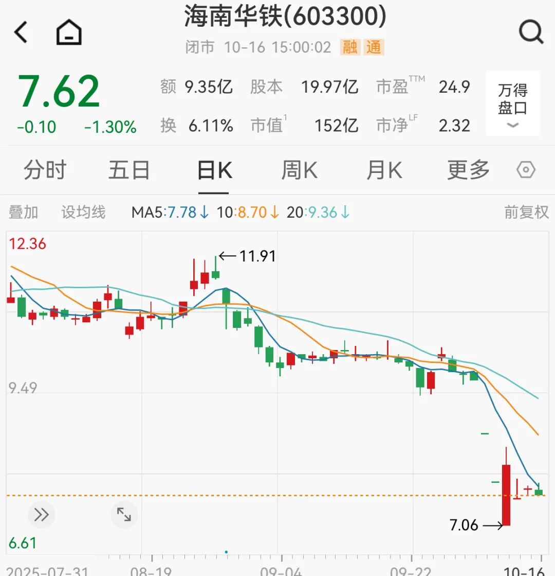 截至10月16日收盘,海南华铁股价报7.62元/股,总市值152亿元。