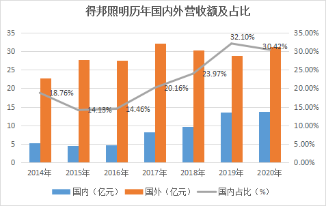 比较有亮点的是得邦照明的内销市场。2016年,得邦照明国内市场营收为4.7亿元,占总营收的14.46%,到了2020年,国内市场的营收为13.7亿元,占总营收30.42%,4年时间里,国内市场增加了9亿元。这对于一家以外销为主的浙商企业而言,得益于强大的制造能力以及正确的国内市场业务布局。