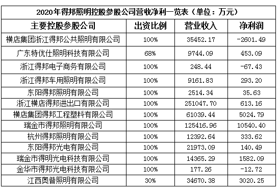 而亏损面比较大的,是横店集团浙江得邦公共照明有限公司,达2600万元。据资料显示,得邦公共照明主要负责LED照明灯具与成套系统、智慧城市管理及智能控制系统的开发和销售,是“照明工程设计专项甲级”和“城市及道路照明工程专业承包壹级”双甲资质企业。2019年末,该公司资产总额达5亿元,净资产约1.48亿元,营业收入约3.09亿元,净利润约为104.36万元。2020年末,资产总额5.1亿元,净资产1.25亿元,营业收入3.55亿元,净利润-26,01万元。