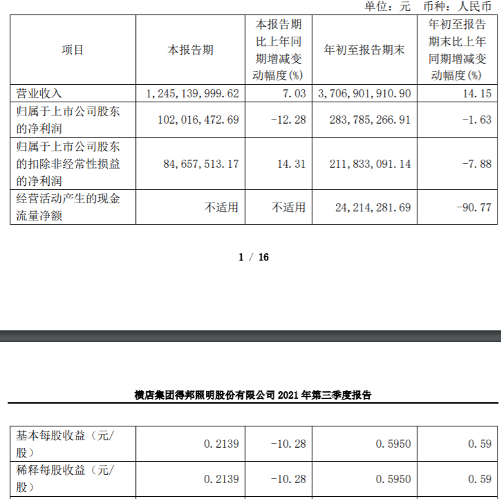 10月28日,得邦照明(603303.SH)发布2021年第三季度报告。