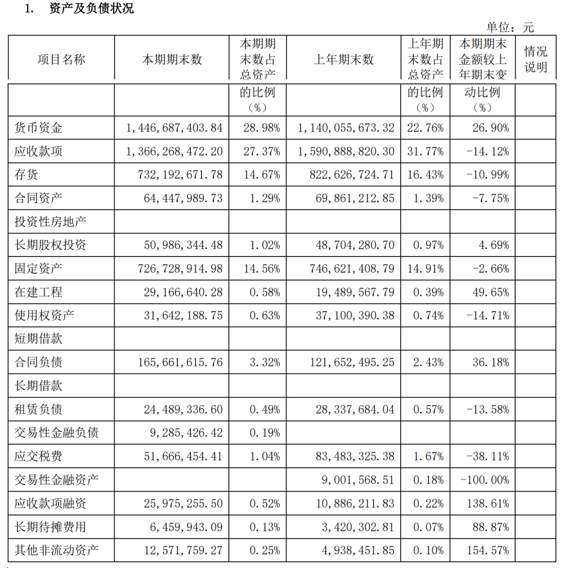 此外,2022上半年,得邦照明货币资金同比上升26.9%,应收款项同比下降14.12%,存货同比下降10.99%,在建工程同比上升49.65%,合同负债同比上升36.18%,长期待摊费用同比上升88.87%。