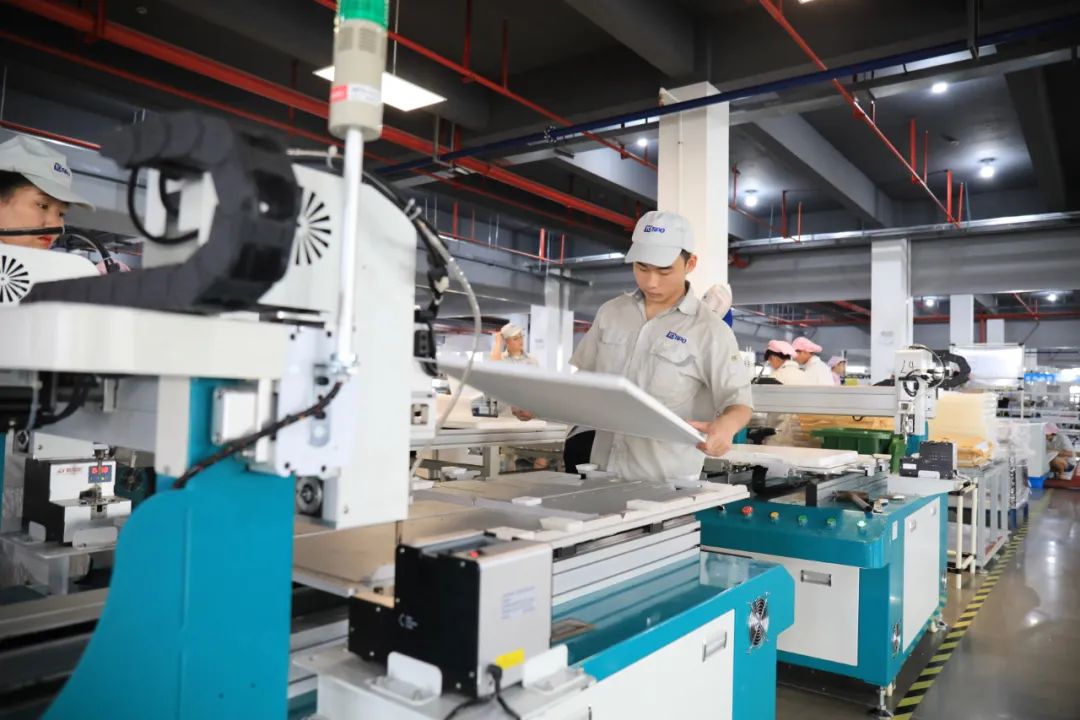 走进横店集团得邦照明股份有限公司民用六车间,宽敞明亮的厂房、一尘不染的地面、忙碌有序的生产让人眼前一亮。偌大的车间里,放眼望去,一排排的生产线非常整齐,视线可以从车间这头直看到对面墙上的窗户。