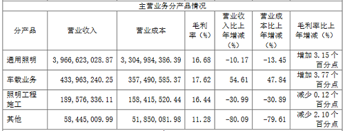 其中,照明业务板块实现营业收入41.56亿元,下降11.39%;车载业务板块实现营业收入4.34亿元,增长54.61%。