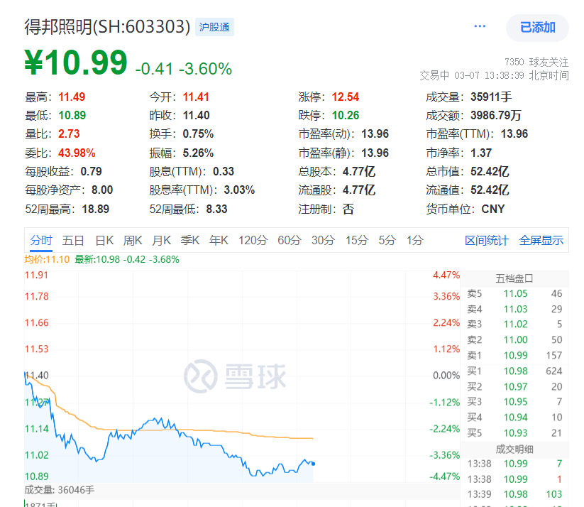 3月7日,截至13:38,得邦照明(603303.SH)股价跌3.6%,报10.99元,总市值为52.42亿元。