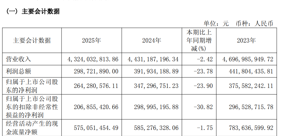 2025年,得邦照明营业收入实现43.24亿元,同比下降2.42%;归属于上市公司股东的净利润实现2.64亿元,同比下降23.90%。