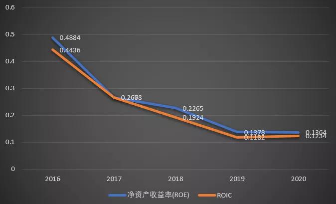 长期来看,投资者投资一家公司得到的回报就是企业的ROE值。2020年,企业的ROE/ROIC分别是13.64%和12.34%。近年来持续下降。