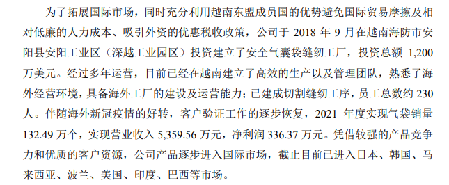 华懋科技2018年9月在越南海防市安阳县安阳工业区(深越工业园区)投资建立了安全气囊袋缝纫工厂。据2021年报,华懋科技的越南工厂在2021年度实现气袋销量132.49万个,营业收入5359.56万元,净利润336.37万元。