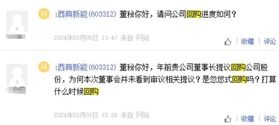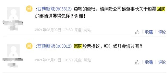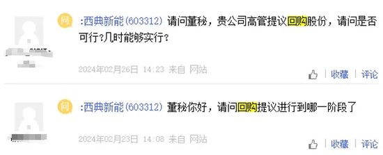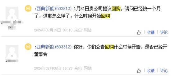 2月5日开始,多位投资者在互动平台询问西典新能:“回购方案有在公司议程提出并制定方案吗?”;“你好,贵公司是否开始回购股票”;“你好,你们公告回购什么时候开始,是否已经开董事会”。